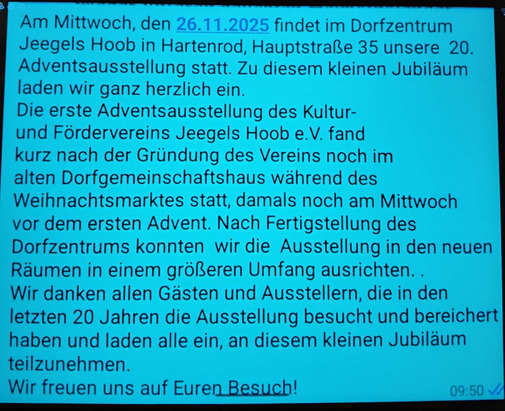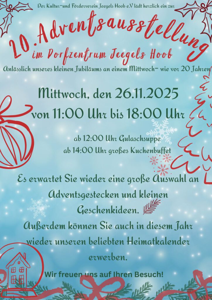 Adventsausstellung am 26. November in Jeegels Hoob mit kreativen Ständen und Kuchenbuffet